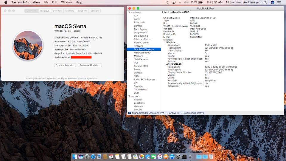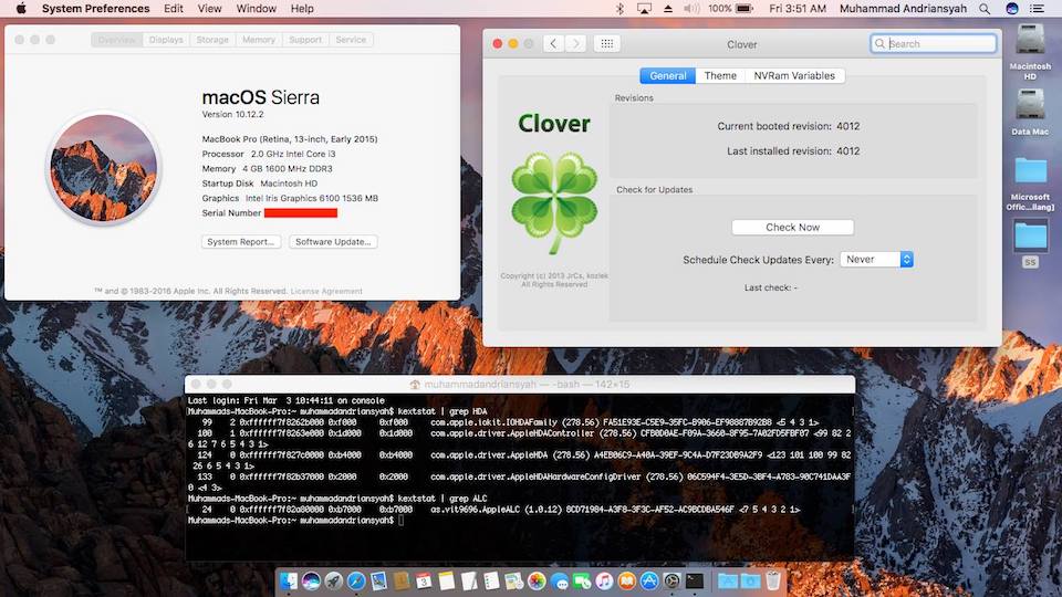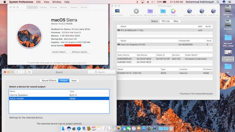 Success Hackintosh macOS Sierra 10.12.2 Build 16C68 at A455LA-WX667D